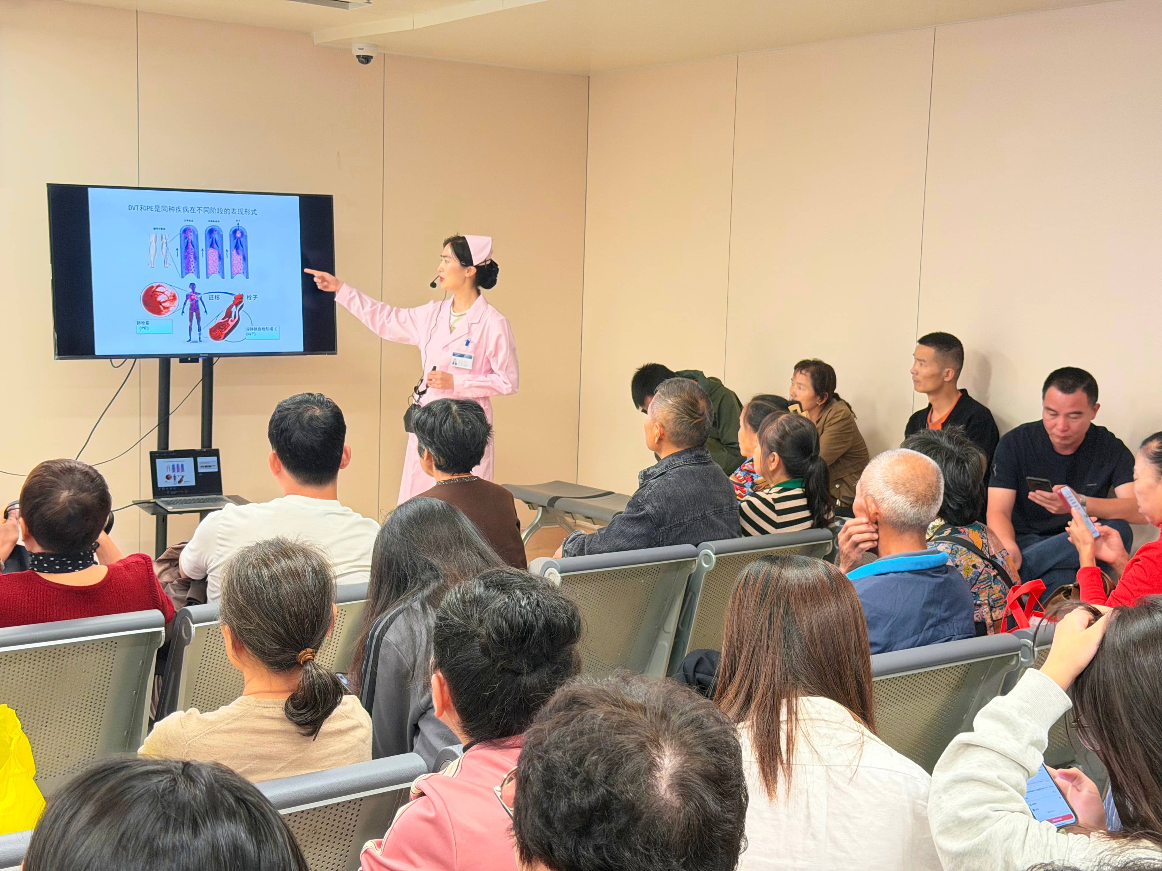 上午11时,健康教育专题讲座《别让血栓流浪》准时开讲。专科护士邓开心结合典型病例,用通俗生动的语言,深入讲解了血栓的形成机制、隐匿特征与潜在危害,重点介绍了在日常生活中易于实施的预防方法。现场座无虚席,听众或专注聆听,或踊跃提问,或认真记录,科普氛围浓厚。最后的预防血栓“脚丫操”互动环节更将现场交流推向高潮。
