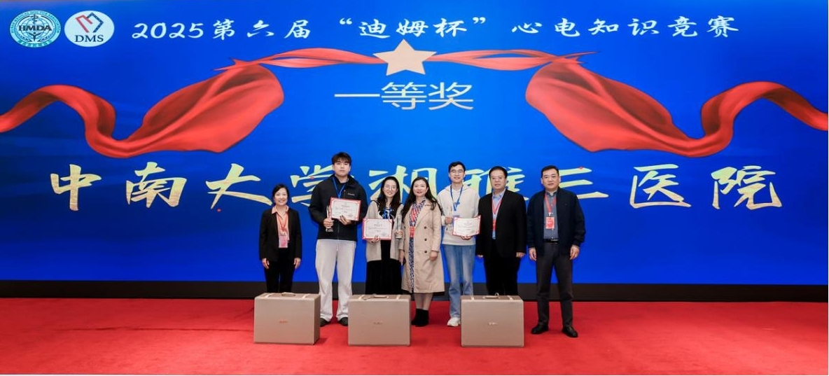 11月16日,由湖南省医师协会举办的“2025年湖南省医师协会心血管内科医师分会第七届学术年会心电知识竞赛”在长沙举行,中南大学湘雅三医院心血管内科心电图室代表队汪文娟、范天鸣、张瀚、陶也荣获湖南省心电知识竞赛冠军。