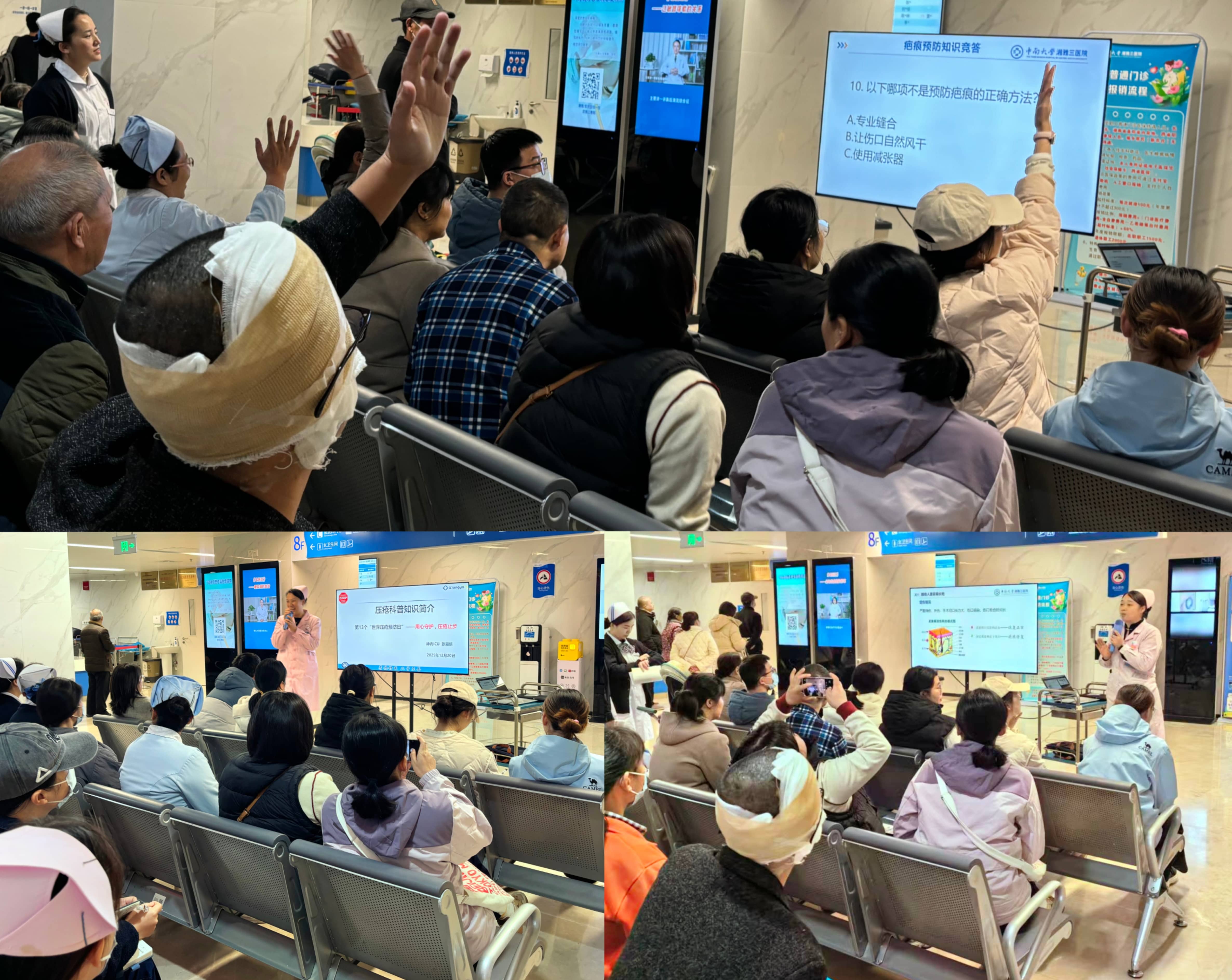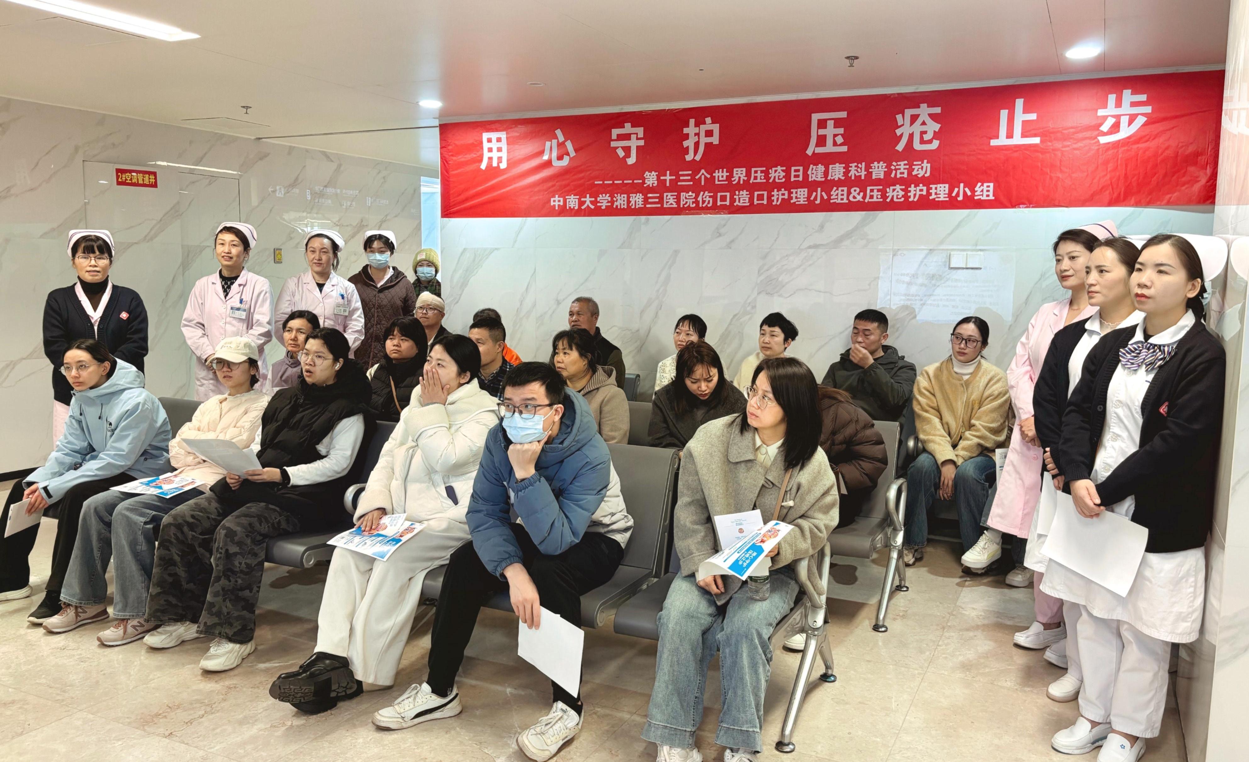 2025年11月20日,是第十三个“世界压疮预防日”,今年的活动主题是“用心守护,压疮止步”。为提升公众及医疗照护者对压疮和疤痕预防的认知水平,普及科学防护知识,20日下午,中南大学湘雅三医院护理部在新门诊楼八楼开展“世界压疮预防日”健康科普活动。在伤口造口护理小组组长卜平元的指导和安排下,伤口造口护理小组副组长阳萍、陈艺伟,压疮管理小组组长龚丽娜、副组长王莎,伤口造口护理小组与压疮护理小组的骨干成员张丽娟、李曦等参加了本次活动。
