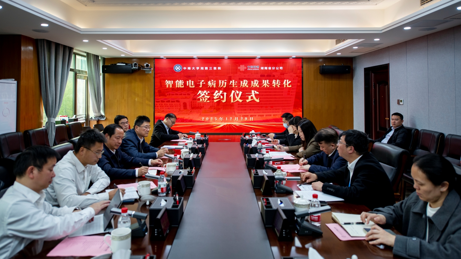 2025年12月29日下午,中南大学湘雅三医院与中国联合网络通信有限公司湖南省分公司在医院综合楼一会议室举行智能电子病历生成成果转化签约仪式。此次合作旨在将湘雅三医院荣获省级一等奖的AI医疗成果推向全省应用,是深化“医工交叉、产教融合”、推动智慧医疗高质量发展的重要实践。医院党委书记何庆南、党委副书记杨飞龙,湖南联通党委书记、总经理周智,党委委员、副总经理杜鹏、林颖等双方管理与技术团队代表共同出席。仪式由湘雅三医院副院长左笑丛主持。