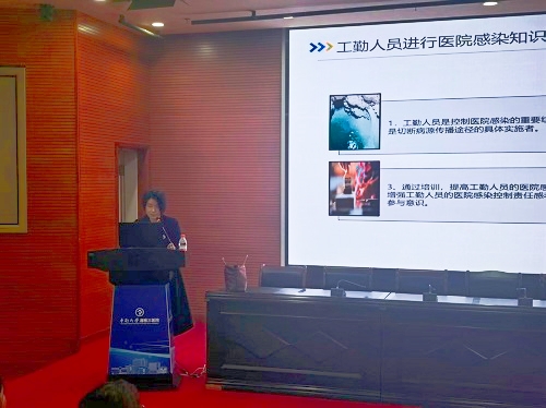 本次培训特邀医院感染控制中心戴灵芝老师授课,她以《工勤人员院感知识培训》为主题,结合《传染病消毒规范》《医疗机构环境表面清洁与消毒管理标准》《医院空气净化管理标准》等多项国家标准和卫生行业规范,针对外包服务单位工作人员的工作特点,进行了系统性、实用性地讲解。培训内容紧密贴合实操需求,重点围绕医院环境清洁消毒的基本原则、常用消毒用品的选择与正确使用方法、不同区域(诊疗区域、公共区域、污物处理区域)的清洁消毒流程及注意事项、医疗废物分类收集与规范处置、个人防护用品的正确佩戴与脱卸、常见传染病的院感防控要点等核心内容展开。