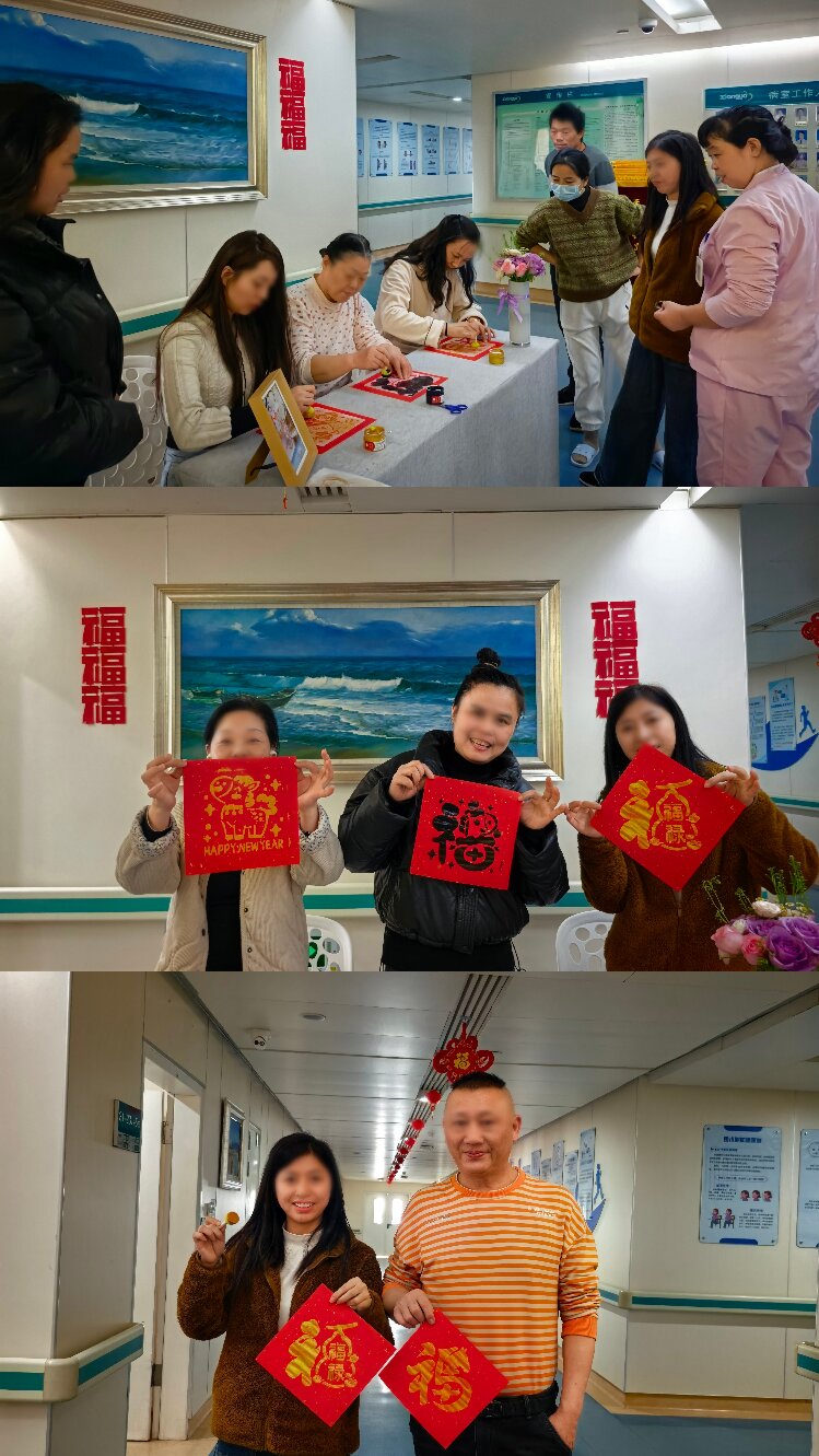 活动当天,病区活动暖意融融,墨香与年味交织。活动伊始,医护人员现场演示了拓印福字的完整流程:匀墨上版、宣纸覆面、鬃刷扫平、缓慢揭纸,在医护人员的耐心指导下,患者与家属纷纷动手尝试,整个活动过程笑声、祝福声此起彼伏,医患之间、医护之间的距离在一次次交流中不断拉近。此次活动共吸引了20余名患者及家属参与,大家带着亲手拓印的福字满载而归,一个个鲜红的“福”字成了病区里最亮眼的新春风景线。此刻,病区成为了充满了人情味的温暖家园,这份亲手创造的“福”,成为连接彼此、辞旧迎新的最美印记。