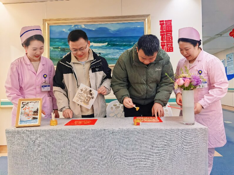 春节是中华民族团圆佳节,对于患者而言,无法回家团聚的遗憾、对病情的担忧及病区整合带来的环境变化,极易给他们带来焦虑情绪。为最大程度降低病区调整对患者的影响,肝胆胰外科二病区主任余枭、副主任孙吉春及护士长徐培提前谋划,在统筹做好患者转运、床位安排、医疗衔接等工作的同时,将人文关怀贯穿整合全过程,策划推出拓印福字特色活动,既传承中华优秀传统文化,也通过亲手拓"福"的仪式感,为患者送上"增福添寿、早日康复"的美好祝愿,确保每一位有意愿参与的患者都能体验到拓福乐趣,打消了患者对病区整合的顾虑。