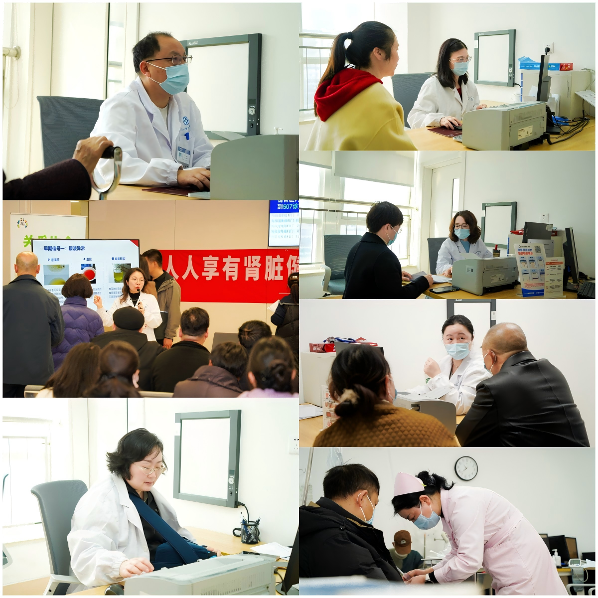上午8点,义诊在新门诊楼5楼正式启动,由肾病风湿病科主任王建文教授、刘纪实教授、孙剑教授、胡静副教授、刘骏医师组成专家团队,与患者面对面答疑,针对慢性肾病、风湿免疫疾病提供生活方式指导、病情管理等专业建议。同时,易斌教授在门诊5楼为肾友们讲解《肾脏病早筛查早诊断及肾性贫血的危害》,倡导公众定期体检,早期识别肾脏异常信号并及时进行干预。