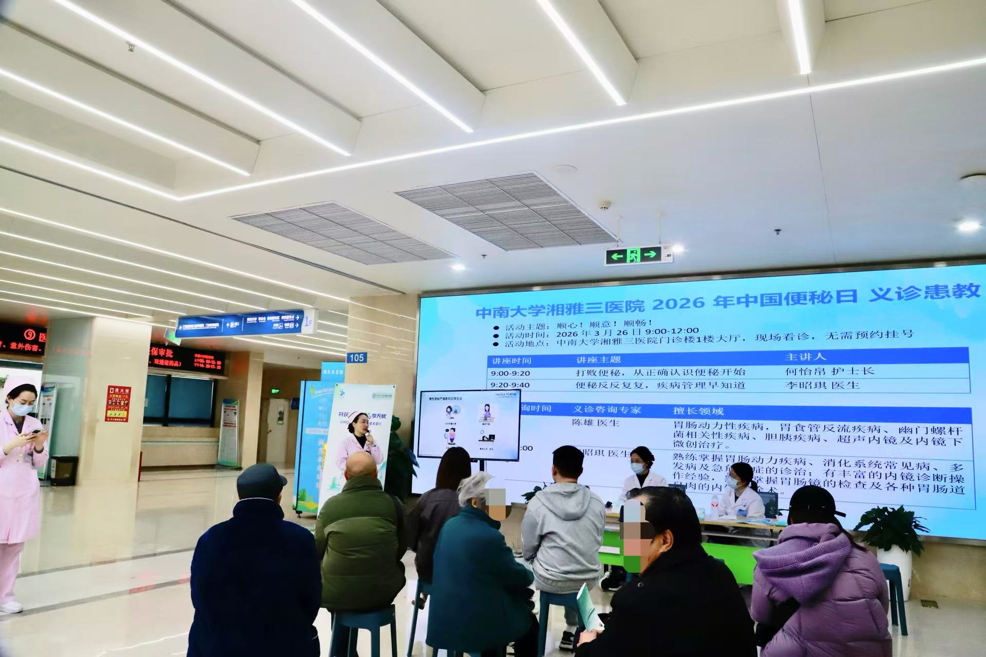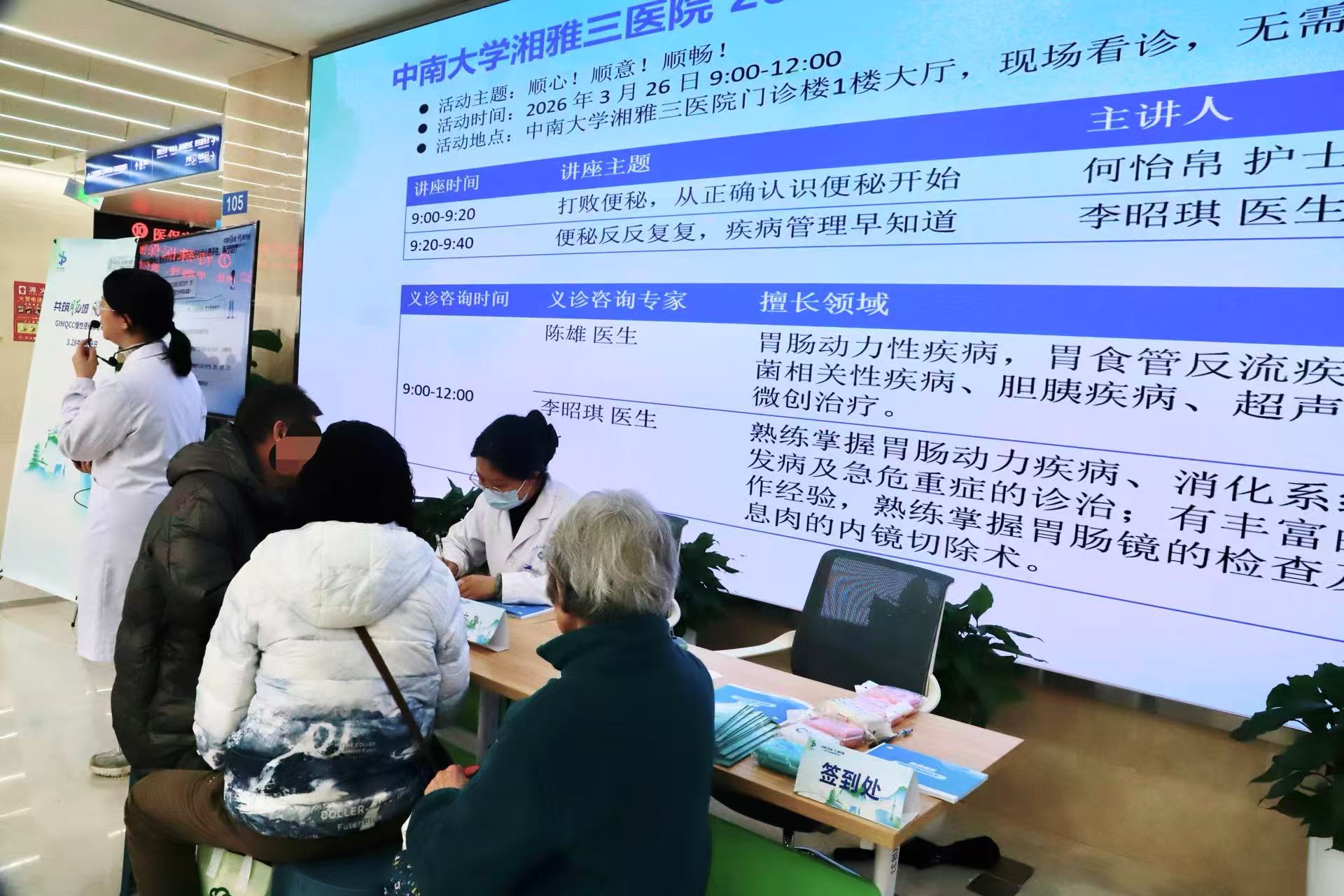 为迎接3・28中国便秘日,提升公众对慢性便秘的科学认知与规范诊疗意识,有效解决群众“排便难、反复治”的困扰,3月26日,中南大学湘雅三医院消化及内镜中心围绕“顺心!顺意!顺畅!”主题,开展慢性便秘义诊咨询与专业患教讲座系列公益活动。在普及便秘防治知识的同时,重点强化内镜筛查在肠道疾病早筛、早诊、早治中的核心作用,为市民送上精准化、科学化的肠道健康解决方案。