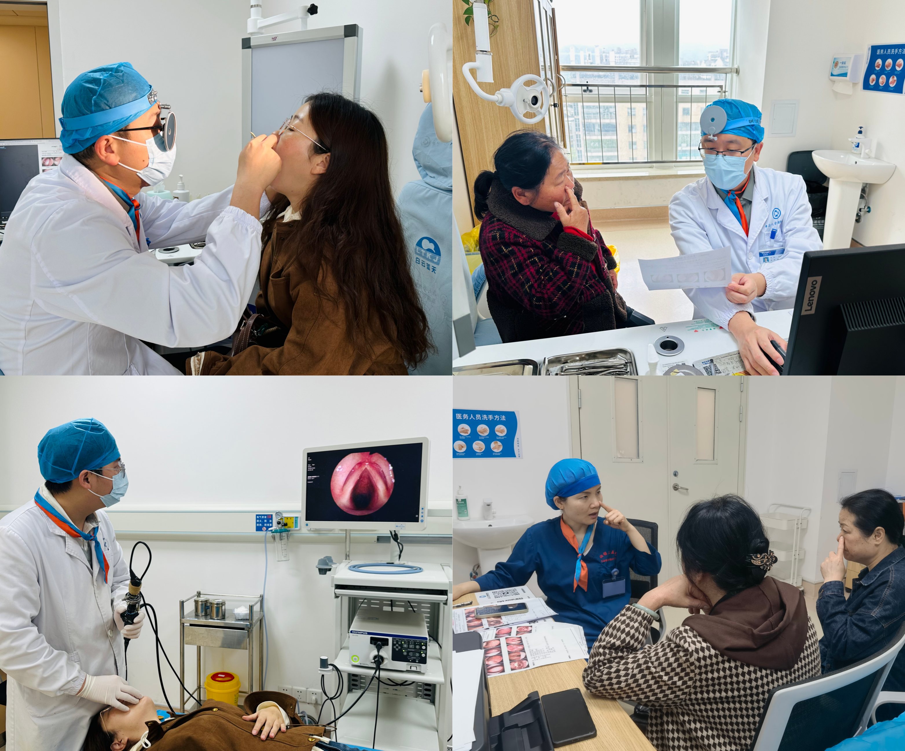 在医院门诊嗓音健康公益义诊现场,耳鼻咽喉头颈外科与康复医学科专家团队联合坐诊,为市民提供全方位、专业化的嗓音健康服务。耳鼻咽喉头颈外科咽喉头颈亚专科主任宋业勋副主任医师在现场耐心地为前来咨询的病友答疑解惑,针对声音嘶哑、咽喉不适、声带病变等问题给出专业诊疗建议;李维副教授作为嗓音康复督导,为嗓音疾病患者、职业用嗓人群提供科学康复指导;王纤瑶主治医师、肖益芳主管护师为市民开展专业嗓音评估与个性化康复指导。
