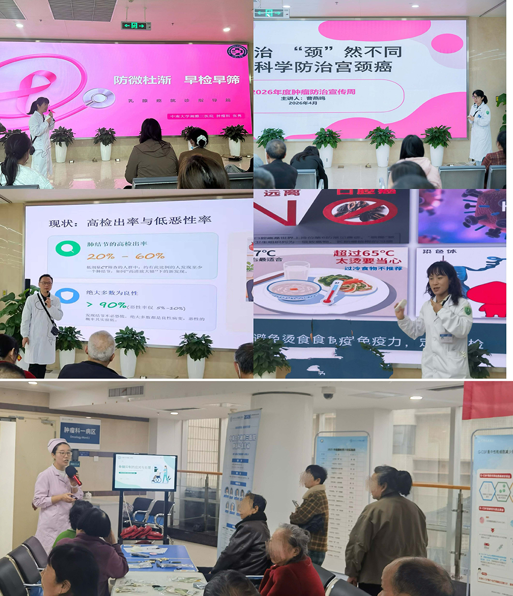 科普讲座,将“早防”知识送到群众身边。整个宣传周,肿瘤科医护团队精心策划了多场科普讲座,覆盖头颈肿瘤、胸部肿瘤、乳腺及妇科肿瘤、消化泌尿肿瘤等多个领域。4月15日,肿瘤科潘曦副主任医师以“口腔溃疡超过两周?当心口腔癌!”为题,曹燕鸣副主任医师以“早筛早治‘颈’然不同——科学防治宫颈癌”为题,分别用通俗语言讲解常见肿瘤的早期信号。4月16日,护理团队郭娜护士长和杨青兰主管护师带来“骨髓抑制的应对与处理”“放射性皮炎和放射性口腔炎的护理”等科普专题,帮助患者及家属掌握治疗副反应的科学管理方法。4月17日,谢思琪主管护师主讲“肿瘤患者腹泻和便秘的管理”,为患者提供细致的症状管理指导。4月21日,张曦副主任医师、张隽副主任医师以“不必纠‘结’,带您了解肺结节”和“防微杜渐,早检早筛——乳腺癌就诊指导”两场讲座圆满收官,全程呼应“早筛早治”主题。整个宣传周期间,肿瘤科全程主导讲座策划与实施,健康管理中心和门诊办积极配合,形成了“临床+体检+门诊”的防癌宣教合力。
