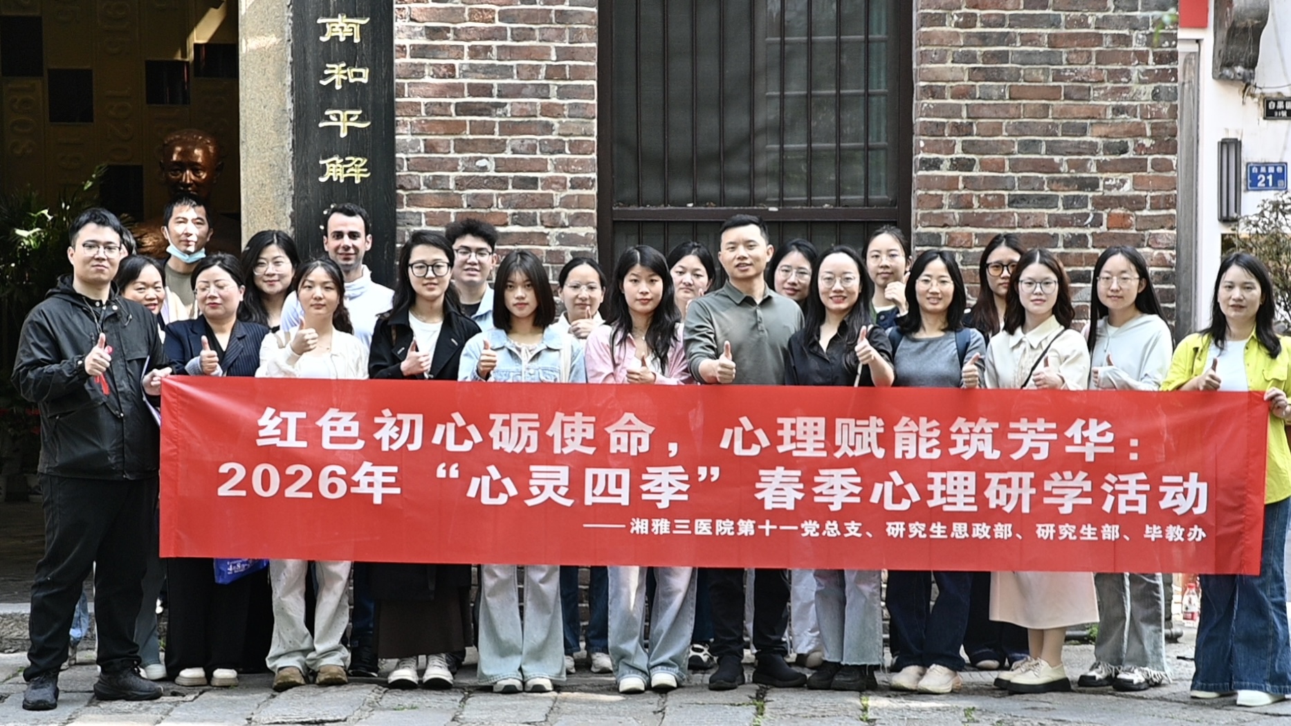 4月25日,由中南大学湘雅三医院第十一党总支、研究生思想政治工作部主办,医院研究生会心理部、朋辈心理互助队联合承办的 “心灵四季”春季心理研学第一季活动——“春遇星城・心灵漫步”城市探险家治愈活动,在长沙市芙蓉区白果园历史文化街区温情启幕。活动紧扣“红色初心砺使命,心理赋能筑芳华”主题开展,在医院党建班导师的带领下,全院研究生党支部骨干、班级干部及思政实践学员共计三十余名青年学子积极参与,沉浸式开启红色思政浸润与心理健康赋能的双重研学之旅。