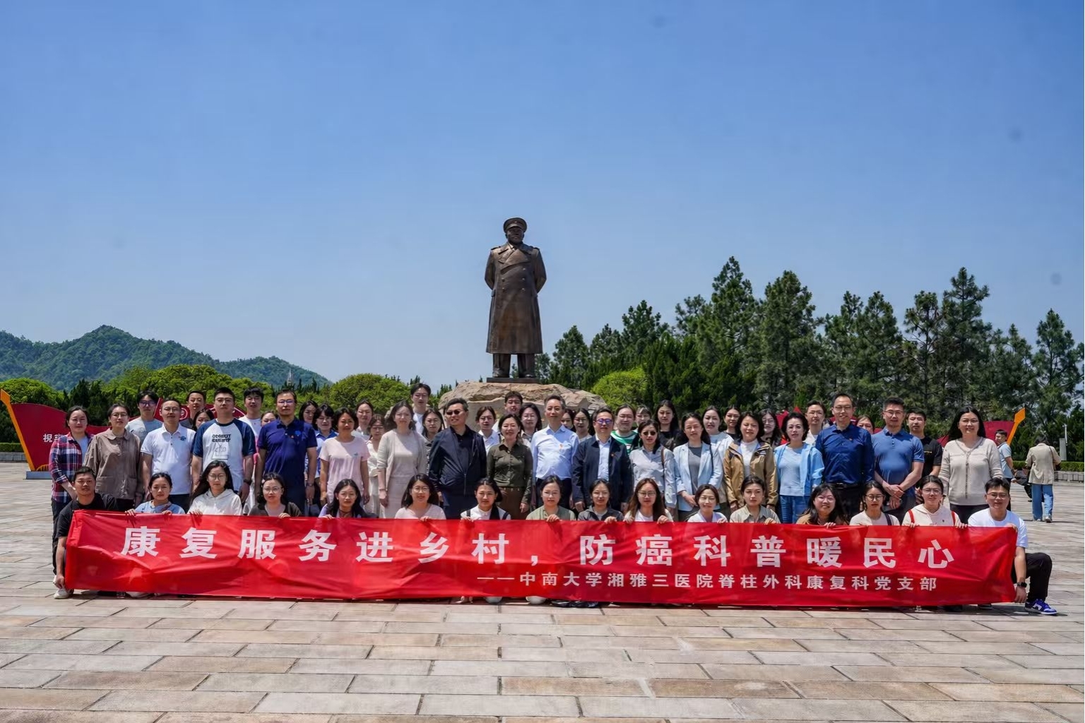 义诊结束后,湘雅义诊团队与走进彭德怀元帅故里,参观彭德怀纪念馆及故居,于铜像广场肃立致敬,深情缅怀革命先辈。团队结合康复医学服务基层的实践感悟展开交流,纷纷表示要将“心系群众、服务基层”的精神融入日常诊疗,持续把以功能重建为核心的优质康复资源送到乡村群众身边。
