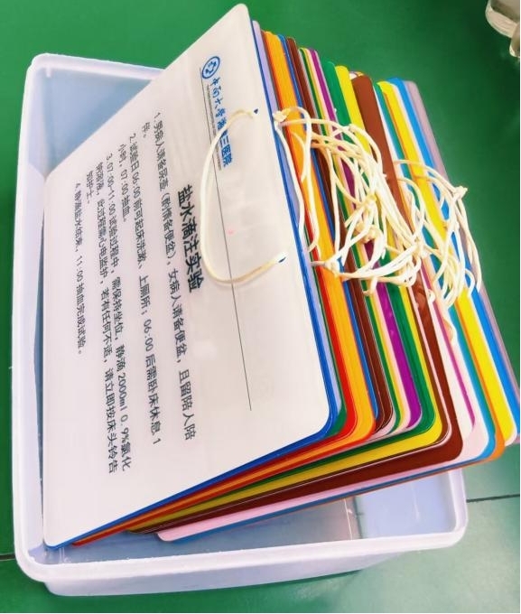 科室护理团队开展头脑风暴,设计了一套彩色功能试验提示牌。盐水滴注试验配白色牌,24小时尿液留取用黄色牌,卡托普利取“咖”谐音用棕色牌——每种颜色对应一种试验,牌上清晰标注流程、时间节点和注意事项。护士做完宣教,直接把牌子挂在患者床头。