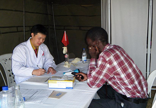 八点半义诊开始,患者在当地志愿者的指引下,进入不同的诊室就诊,因为有的患者不会讲英语,当地卫生部门还派了几位护士做翻译。医疗队的每一位医生对患者热情接待,详细询问病史和检查,然后开处方,患者拿着处方单去药房免费领药。现场看到不少患者扶老携幼,全家前来就诊,原来很多患者家境贫穷,根本付不起昂贵的医药费,得了病只好拖着,听说中国医疗队可以免费看病、领药,就兴高采烈地全家来就诊了。短短一个半小时医疗队就接诊了100多名患者,这时负责分诊的张宇医师急急忙忙地通知大家,患者太多了,要加快速度。帐篷内的温度很高,队员们穿着厚厚的白大褂,不一会就汗流浃背了,但看到那么多患者期盼的眼神,队员们都顾不得休息。到下午三点半,援津医疗队总共接待了300多名患者,免费发放了很多药品。