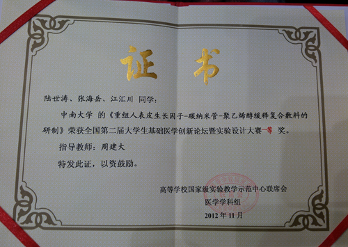 11月4日,第二届全国大学生基础医学创新论坛暨实验设计大赛在天津落下帷幕。由中南大学湘雅三医院烧伤整形外科周建大教授指导的学生团队以“重组人表皮生长因子-碳纳米管-聚乙烯醇缓释复合敷料的研制”喜获创新论坛一等奖。