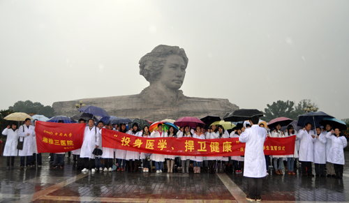 11月16日上午9点,橘子洲头,一群身着白色大褂的湘雅三医院2012级研究生冒着滂沱大雨举行了一场庄严的“投身医学、捍卫健康”医学宣誓仪式。中南大学研究生工作部副部长姚勇、我院主管研究生教学副院长黄飞舟、研究生部和医务部老师共同出席了本次活动。