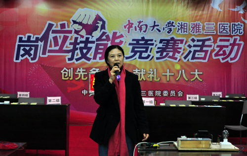 罗爱静书记率先致辞,她说,恰逢十八大闭幕,新一届领导人和大家见面之际,湘雅三医院第一届岗位技能竞赛也拉开了帷幕。这是一项非常有意义的活动,既是以实际行动献礼十八大,也是医院创先争优工作的延续。我们大家从事的都是服务工作,创先争优就是要练好服务本领。希望大家通过比赛练真本领、长真知识,立足岗位铸佳绩,用最好的本领服务大众。