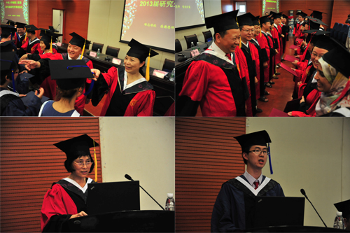 典礼在高昂的国歌中拉开帷幕。首先,罗爱静书记宣读了2013届校级、省级优秀毕业研究生名单,并表示祝贺。紧接着学位授予仪式开始,院领导为10名硕士毕业生代表和10名博士毕业生代表授予学位,为毕业生代表颁发证书、拨穗,并合影留念。全体毕业生度过了他们人生历程中激动难忘的时刻。