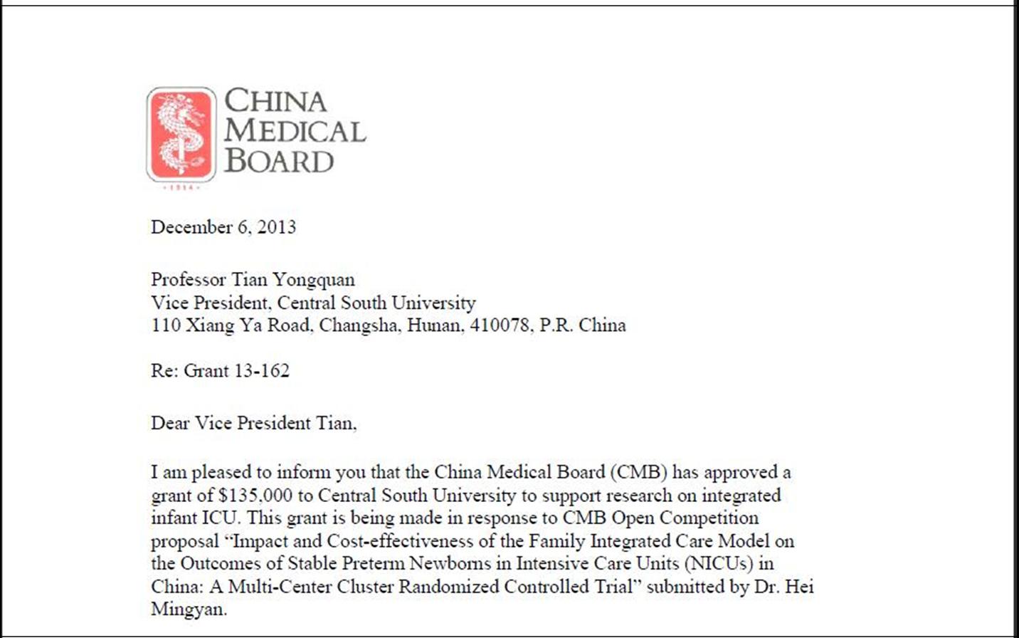 近期获悉,湘雅三医院儿科在2013年获得美国中华医学会(CMB)课题资助以来,由儿科黑明燕教授牵头的多中心临床科研课题《Impact and Cost-effectiveness of the Family Integrated Care Model on the Outcomes of Stable Preterm Newborns in Intensive Care Units (NICUs) in China: A Multi-Center Cluster Randomized Controlled Trial》获得2014年CMB课题资助,资助金额13.5万美元,成为中南大学2014年获得的两项美国中华医学会公开竞标课题(CMB OC课题)之一。湘雅三医院儿科成为中南大学三所附属医院中唯一一个连续两年获得CMB课题资助的临床科室。